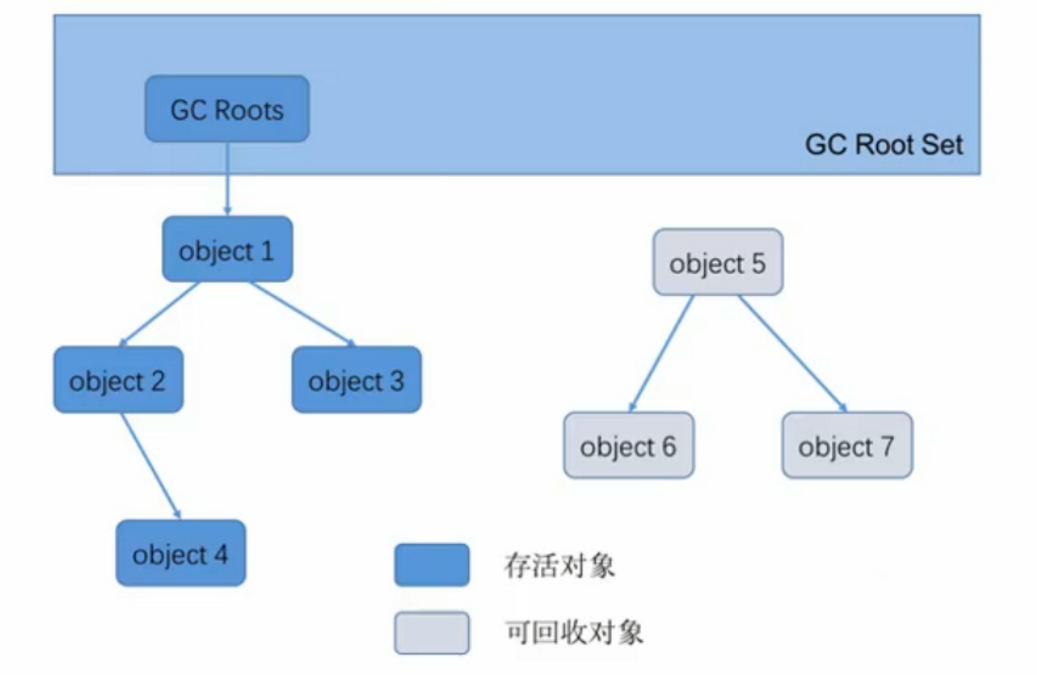 - 它是从GC Roots开始,从上到下根据引用判断是否能链接到目标对象。 可以达到目标对象,就不是垃圾;达不到的对象就是垃圾。等待回收