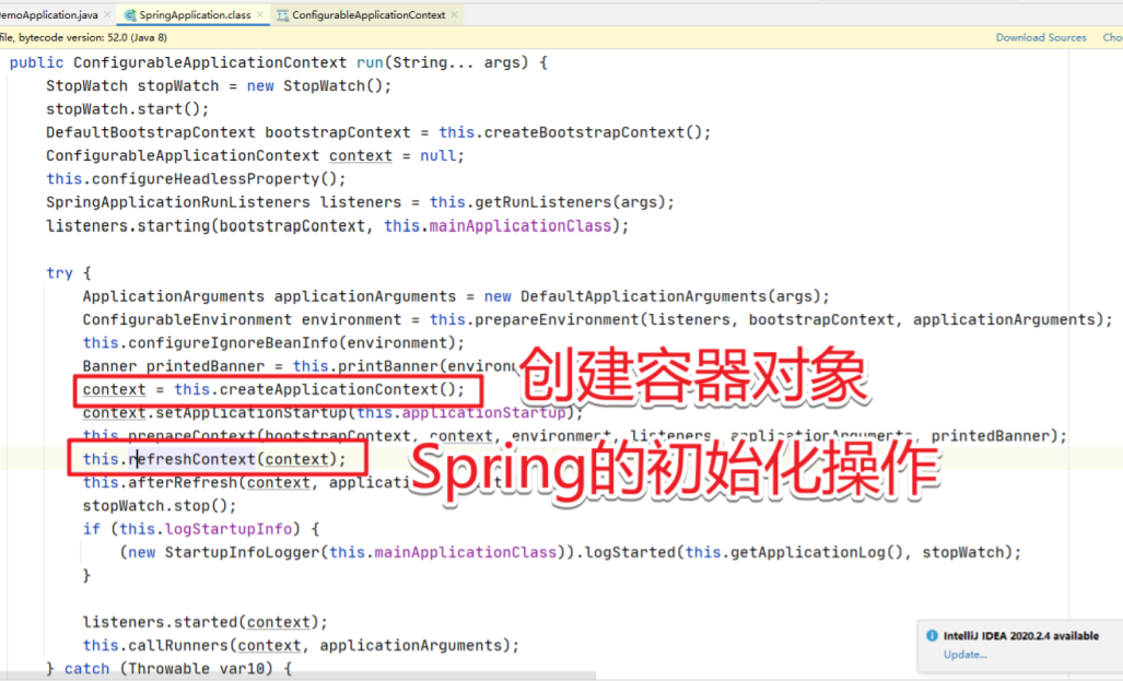 // run 方法的返回对象是 ConfigurableApplicationContext 对象,