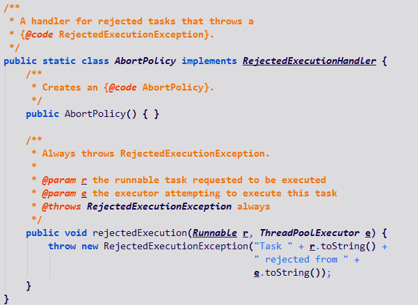 ThreadPoolExecutor.AbortPolicy:丢弃任务并抛出RejectedExecutionException异常。