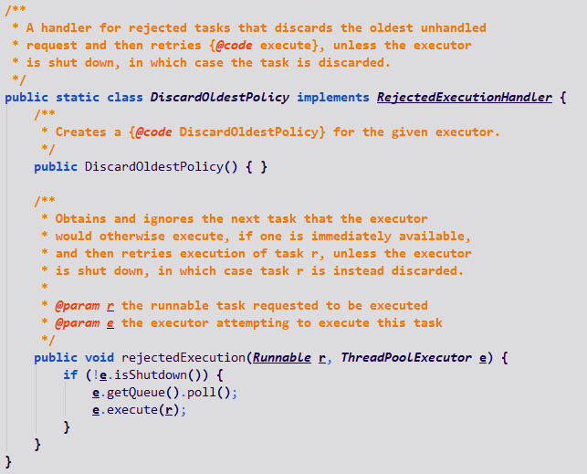 ThreadPoolExecutor.DiscardOldestPolicy:丢弃队列最前面的任务,然后重新提交被拒绝的任务