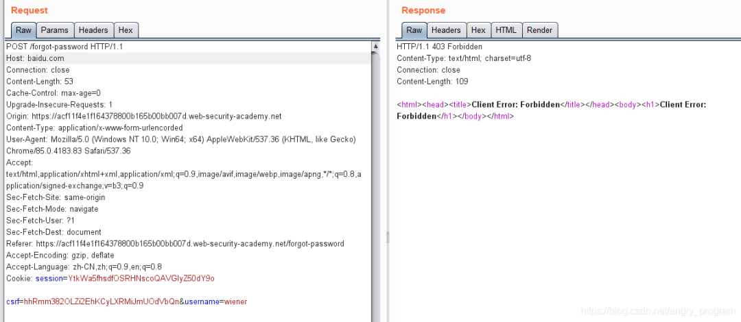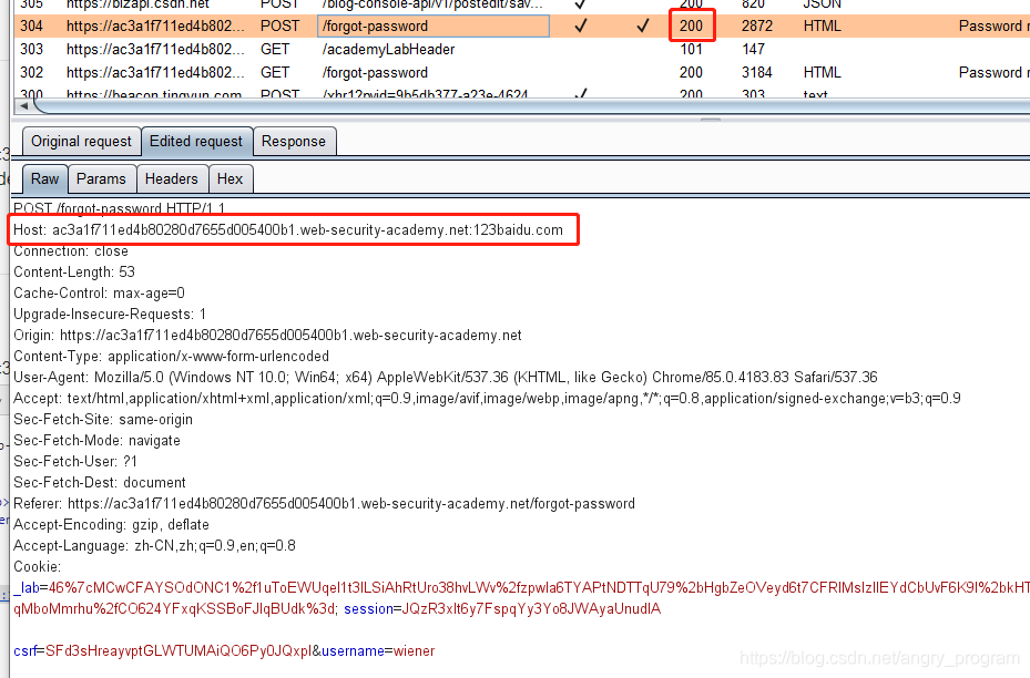 这里就输入受害用户carlos进行重置密码,然后抓包将Host头的值改为我们自己的服务器: