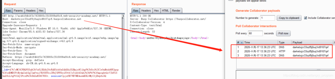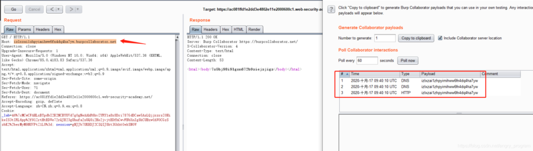 这里我使用Burp自带的 “Burp Collaborator client” 来实现外带: