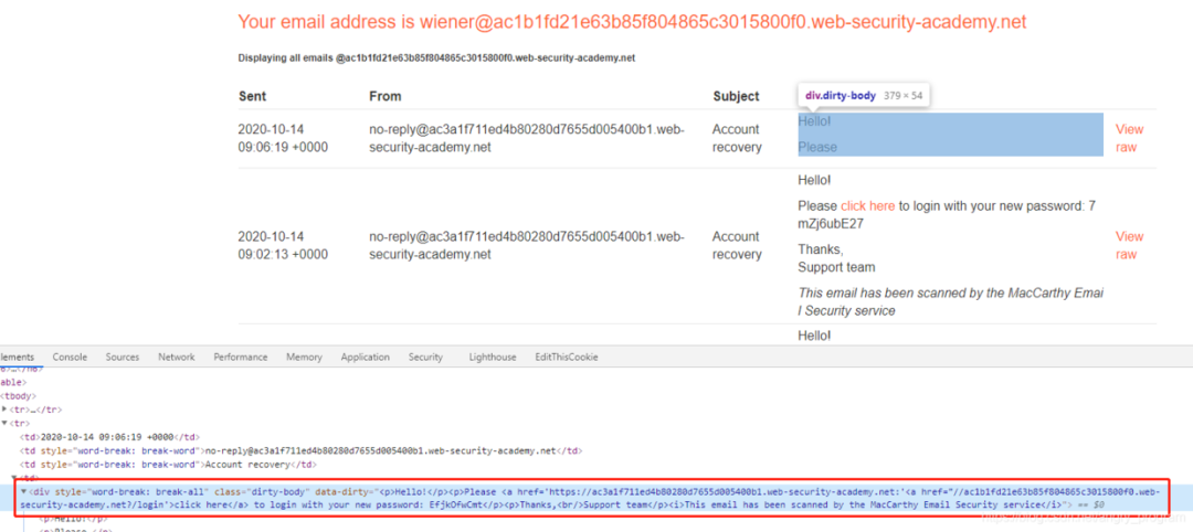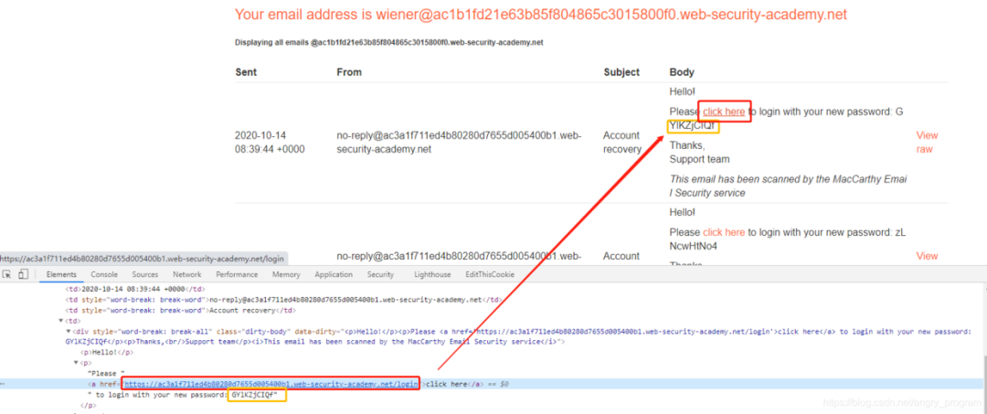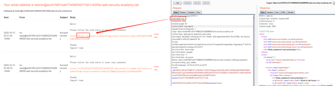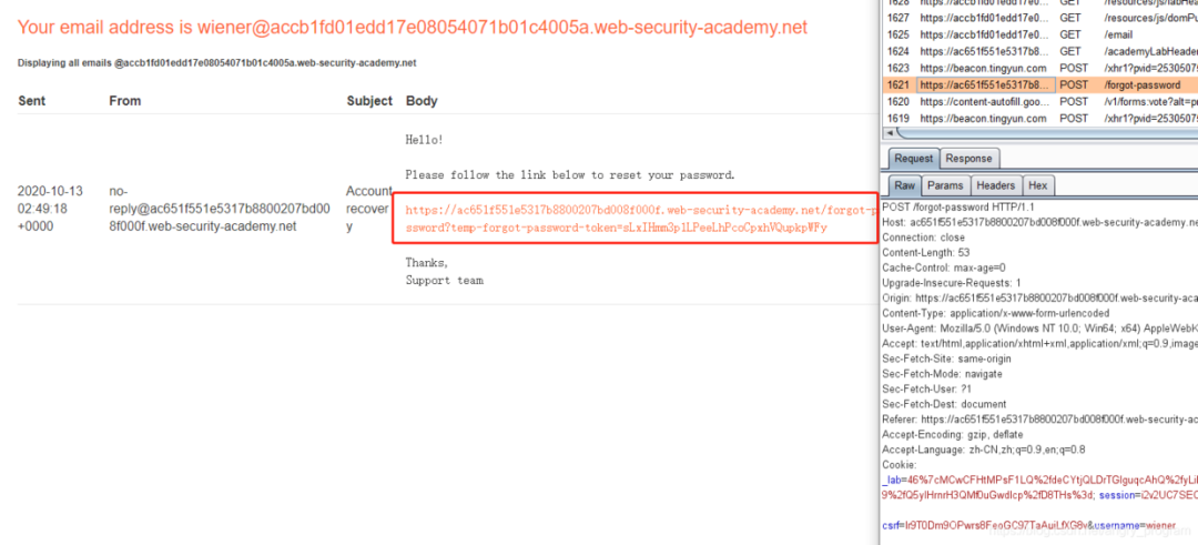 提交之后,会发送一封重置密码的电子邮件到wiener用户的邮箱中(数据包如右图):