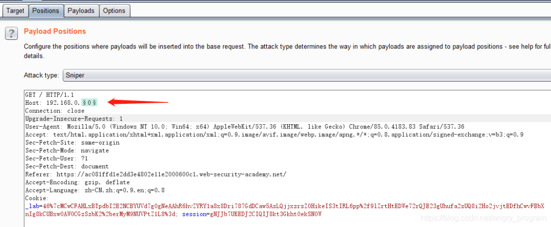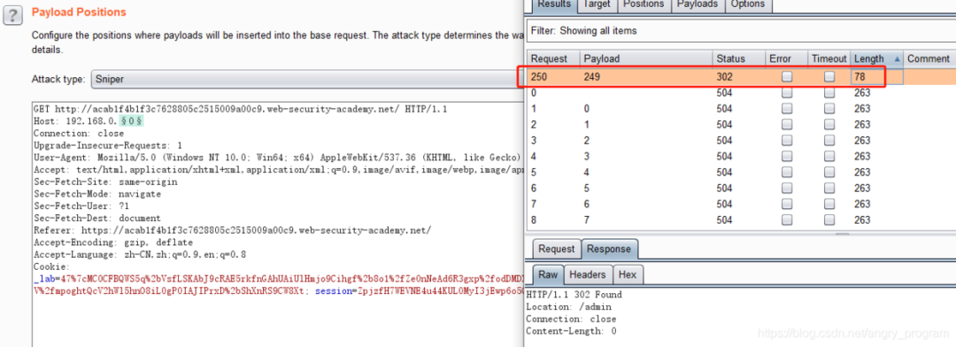 假如一些敏感的页面(比如管理页面),深处于内网,外网无法访问,但是通过Host头攻击+SSRF可达到绕过访问控制,从而访问内网资产,这里Fuzz内网的IP的C段为192.168.0.0/24,直接利用Intruder枚举: