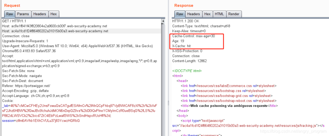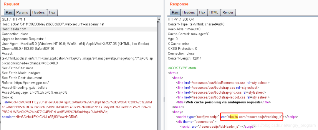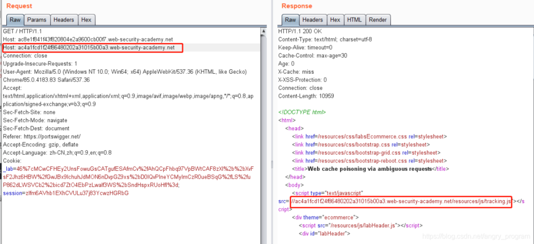 从上图中也可以发现,站点使用了Wen缓存功能,并且配合Host头攻击,可以缓存 /resources/js/tracking.js资源文件。
