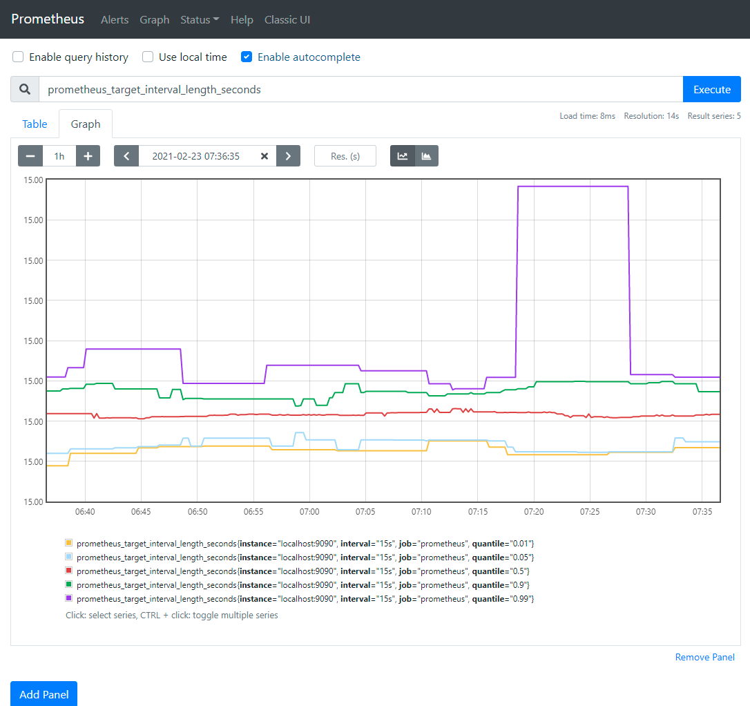 这应该返回多个不同的时间序列(以及每个序列的最新值),每个序列的指标名称均为prometheus_target_interval_length_seconds,但具有不同的标签。