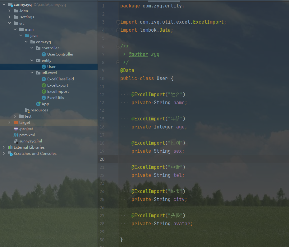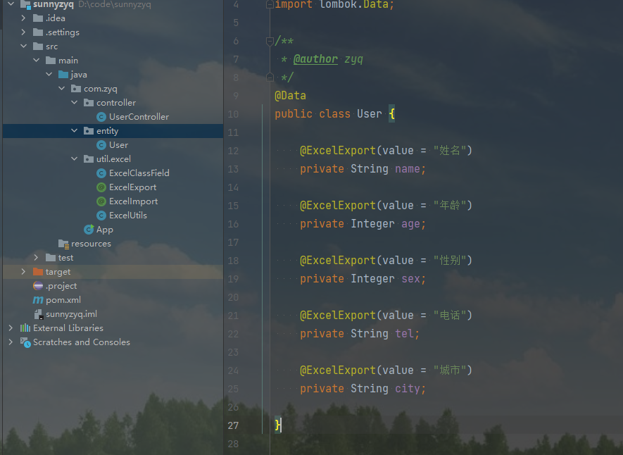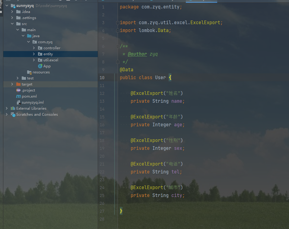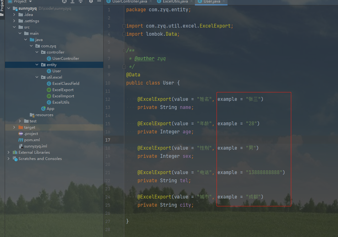 我们在做数据导入的时候,往往首先会提供一个模版供其下载,这样用户在导入的时候才知道如何去填写数据。导出模板除了可以用上面的动态导出,这里还提供了一种更加便捷的写法。只需要创建一个类,然后再对应字段上打上 @ExcelExport 注解类即可。