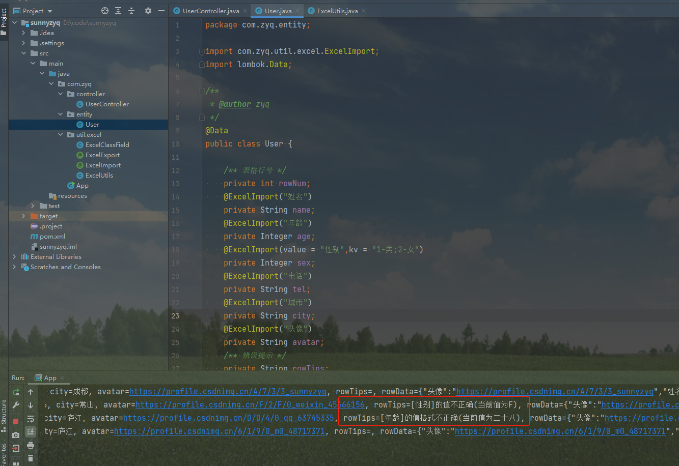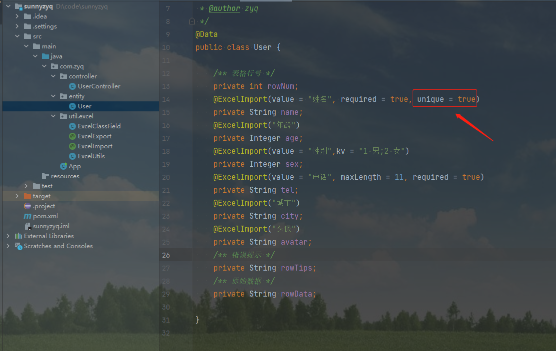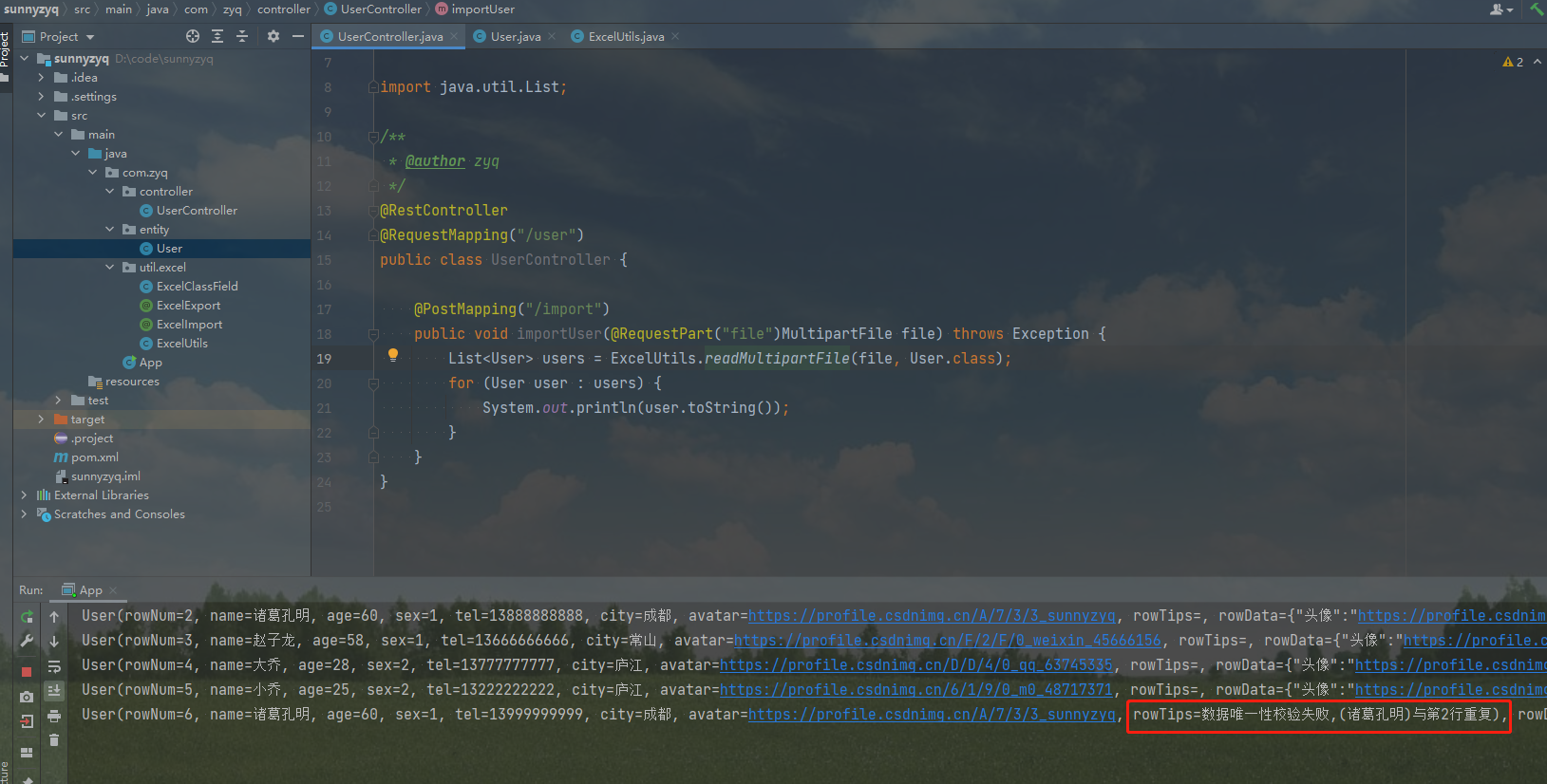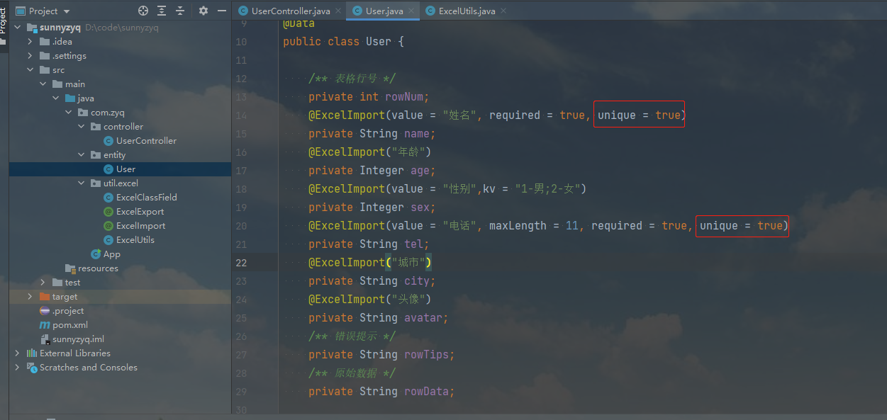 我们在导入数据的时候,某个字段是具有唯一性的,比如我们这里假设规定姓名不能重复,那么则可以在对应字段的 @ExcelImport 注解上加上 unique = true 属性。