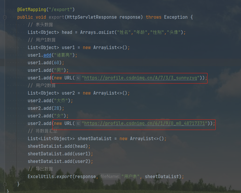 如果你的导出中,需要将对应图片链接直接显示为图片的话,那么,这里也是可以的,只需要将对应的类型转为 java.net.URL 类型即可(注意:转的时候有异常处理,为了方便演示,我这里直接抛出)