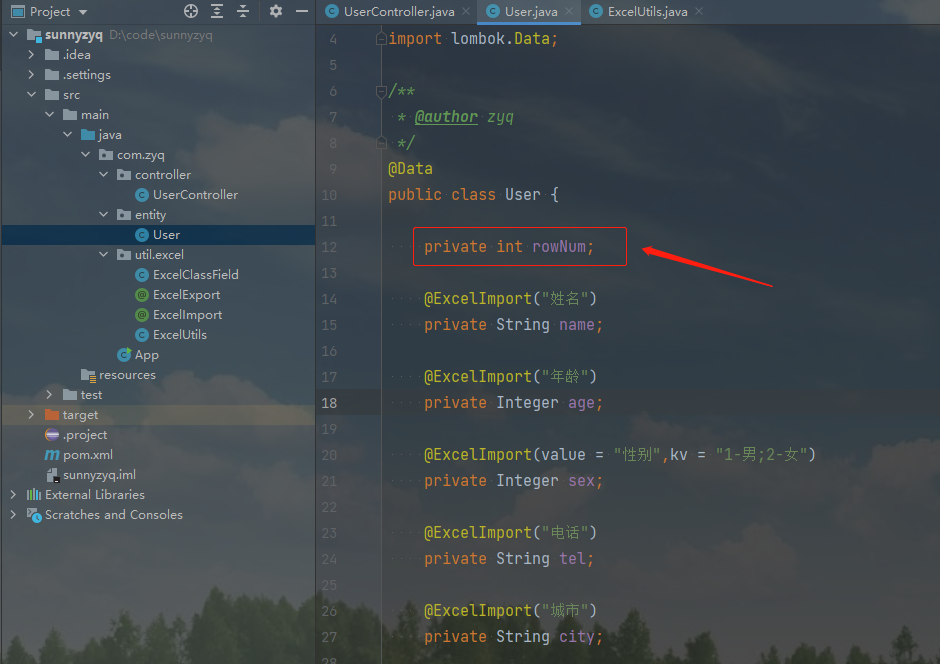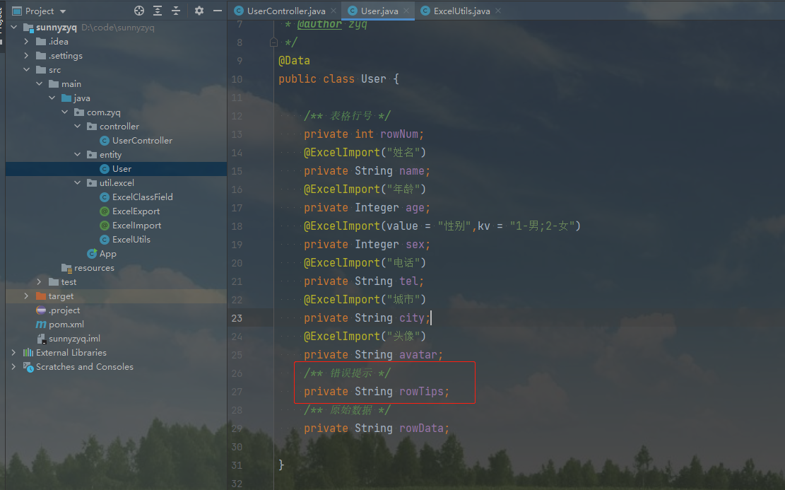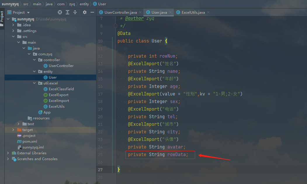 在做页面数据导入的时候,如果某行存在错误,一般我们会将原始的数据拿出来分析,为什么会造成数据错误。那么,我们在实体类中,增加一个 String 类型的 rowData 字段即可。