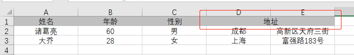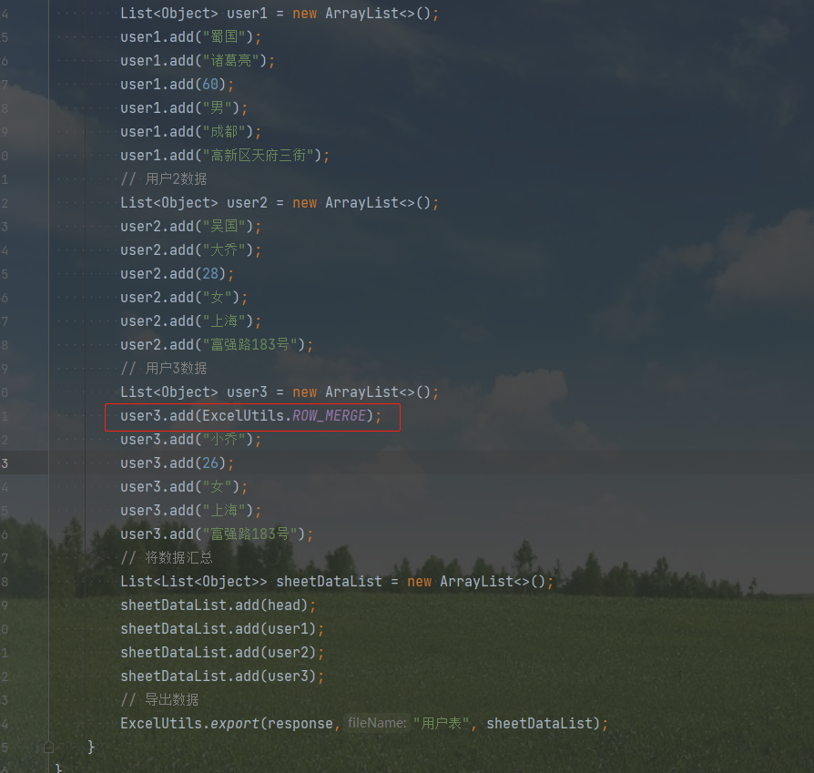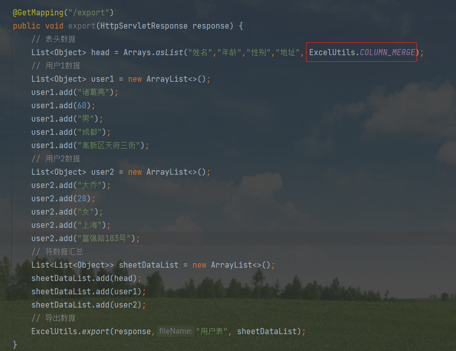 比如,我们将表头横向合并,只需要将合并的单元格设置为 ExcelUtils.COLUMN_MERGE 即可。