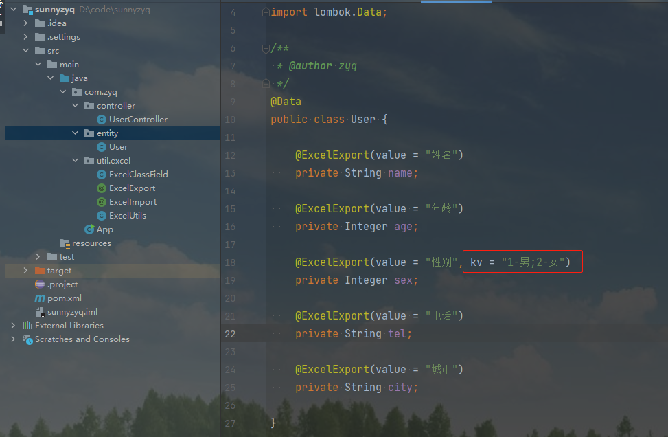 那么,我们只需要将Java实体中的对象sex字段的类型改为对应的数字类型Integer,然后再注解中配置好 kv 属性(属性格式为:键1-值1;键2-值2;键3-值3;.....)