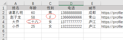 比如,我们将表格中赵子龙的性别改为F(F并不是映射数据),将大乔的性别改为二十八(不能转换为Integer类型数据)。