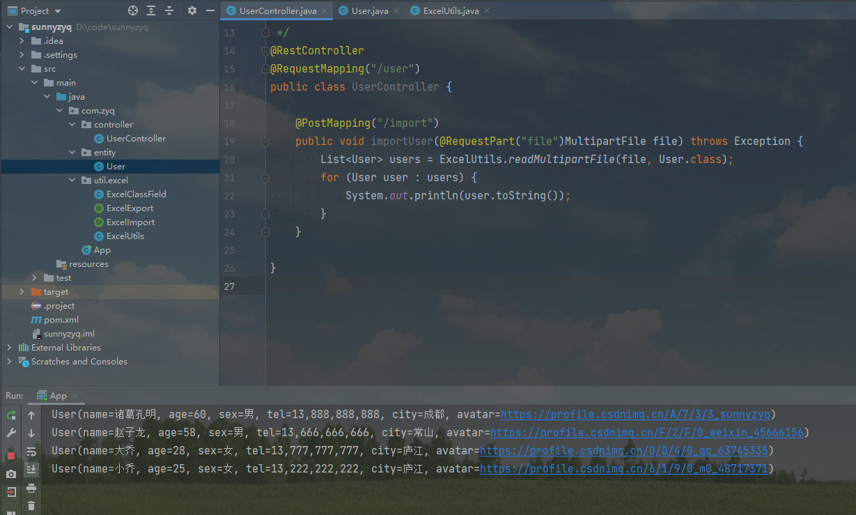 List<User> users = ExcelUtils.readMultipartFile(file, User.class);