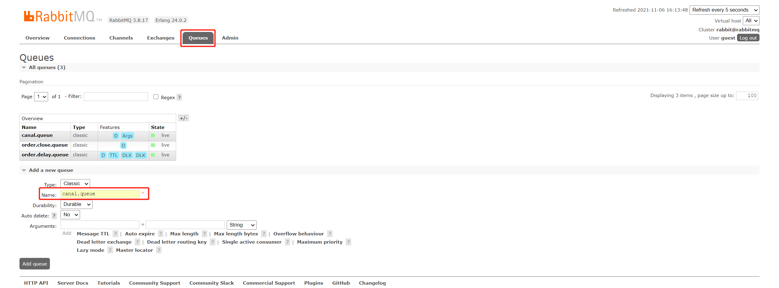 ?️ 如果使用有来项目线上 RabbitMQ 测试,记得需要新建队列,否者多人消费同一队列会让你觉得 Canal 监听数据有丢失的现象。