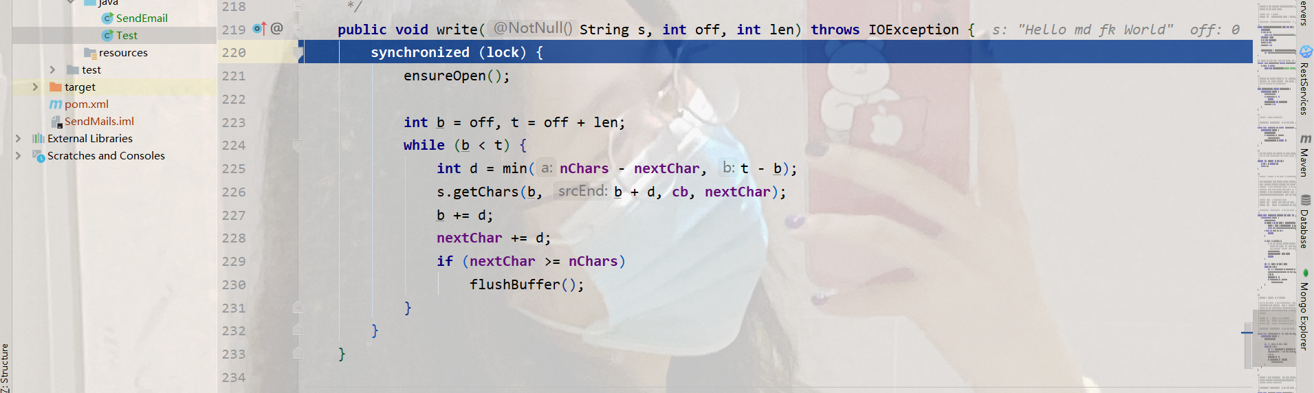 进入write方法,我们会发现这里有一个同步锁。学过Java语法的同学应该马上就反应到了,这是防止在多线程的情况下,一个字符串还未处理完,另一个字符串便进来这个方法了,这会导致内部的数据出现矛盾!!接着是执行一个ensureOpen方法,按照我的蹩脚英文hh,初步理解这是“确定是否打开”的意思。那我们就进去看看到底是确定什么是否打开!