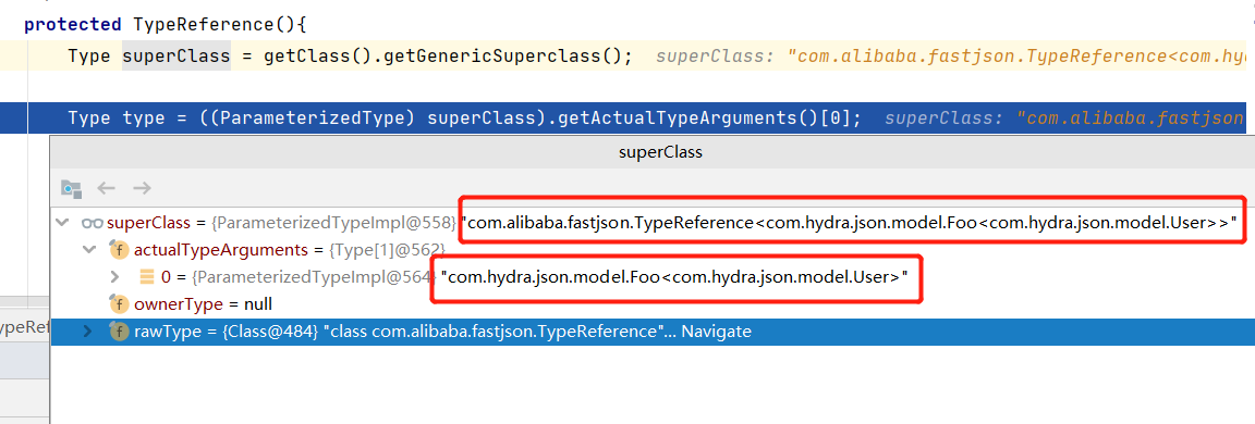 Foo中的obj类型为User,符合我们的预期。下面我们就看看,fastjson是如何借助TypeReference完成的泛型类型擦除后的还原。