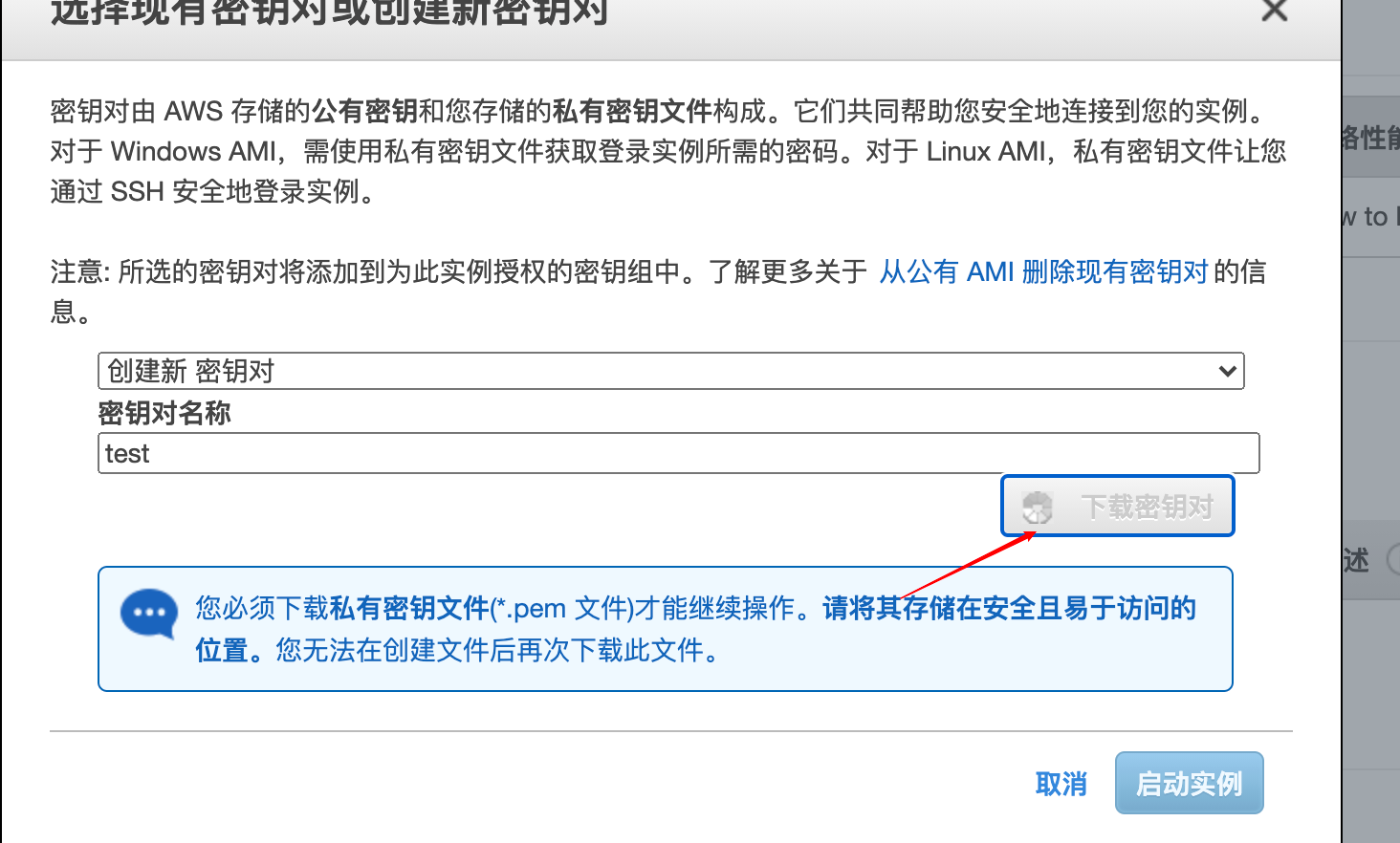创建完就下载它,然后点击启动实例
