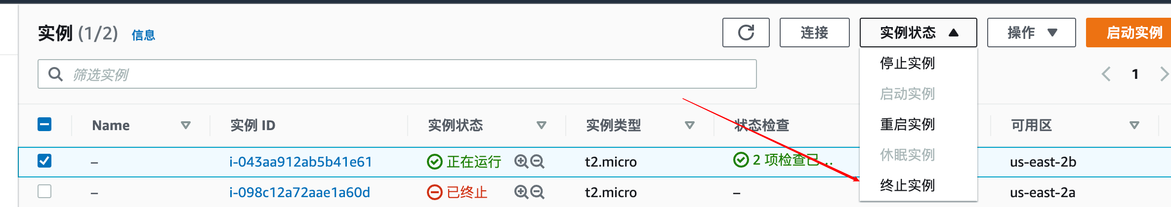 在控制台选中实例,点击实例状态->终止实例