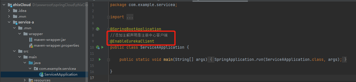 配置微服务的入口文件 @EnableEurekaClient (service-a和service-b的都要加)