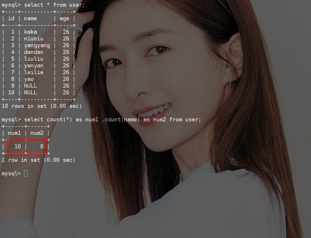 select count(*) as num1 ,count(name) as num2 from user;