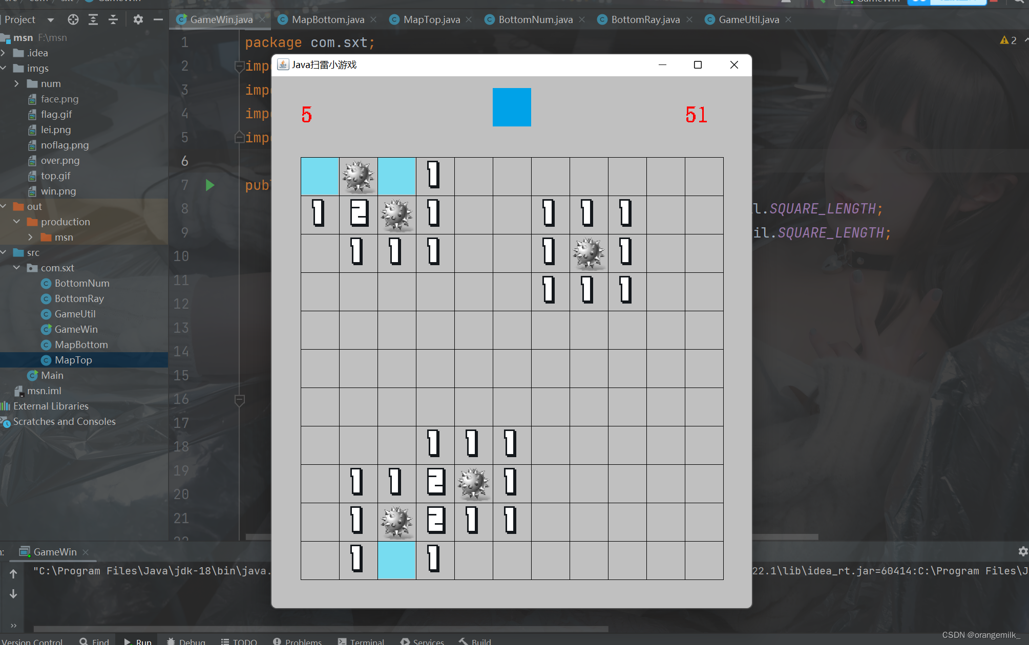 本程序共封装了五个类,分别是主类GameWin类,绘制底层地图和绘制顶层地图的类MapBottom类和MapTop类,绘制底层数字的类BottomNum类,以及初始化地雷的BottomRay类和工具GameUtil类,用于存静态参数和方法。
