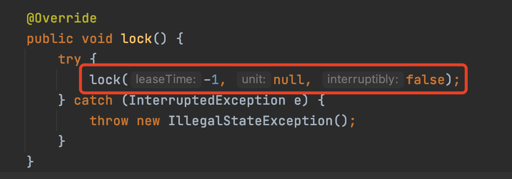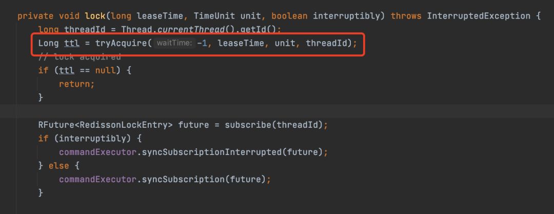 lock方法会调用重载的lock方法,传入的leaseTime为-1,调用到这个lock方法,之后会调用tryAcquire实现加锁的逻辑。