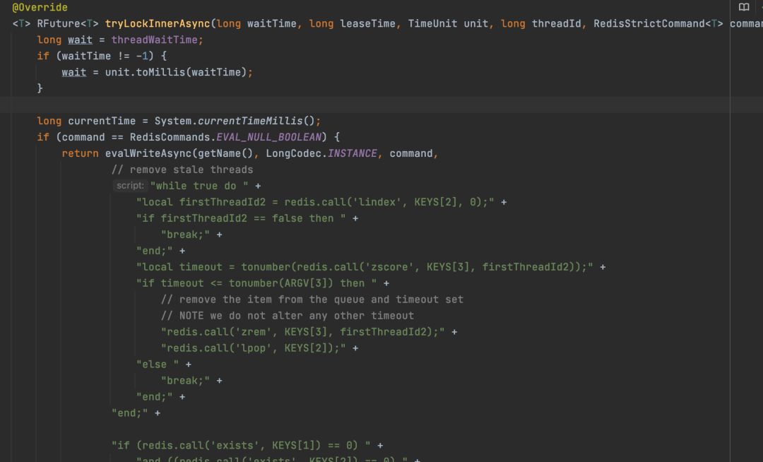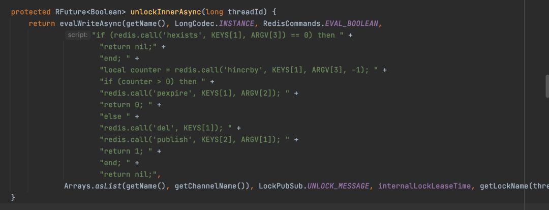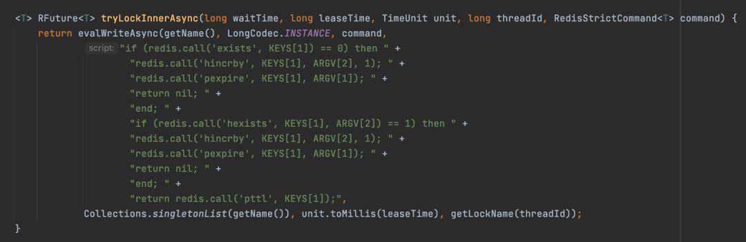 通过tryLockInnerAsync方法的实现可以看出,最终加锁是通过一段lua脚本来实现加锁的,redis在执行lua脚本的时候是可以保证加锁的原子性的,所以Redisson实现加锁的原子性是依赖lua脚本来实现的。其实对于RedissonLock这个实现来说,最终实现加锁的逻辑都是通过tryLockInnerAsync来实现的。