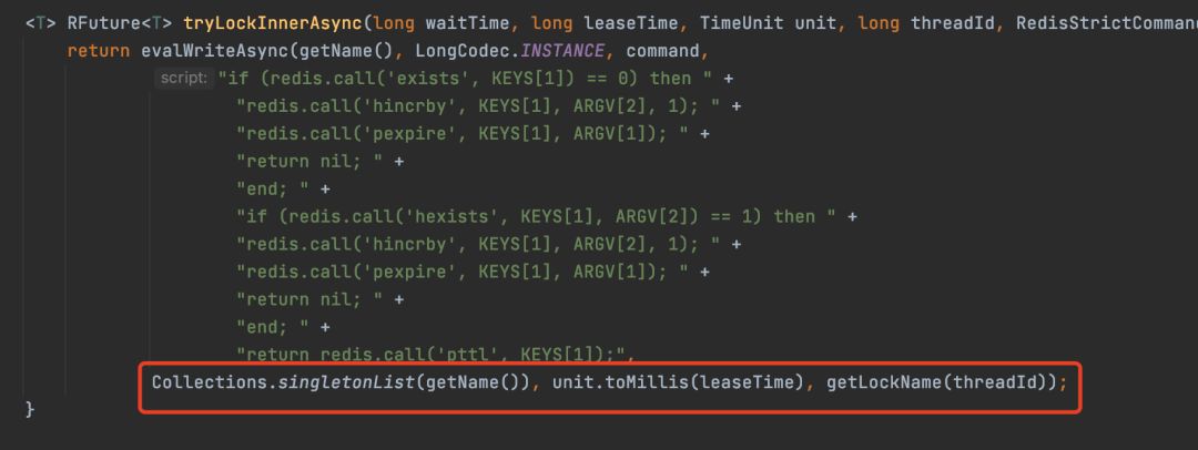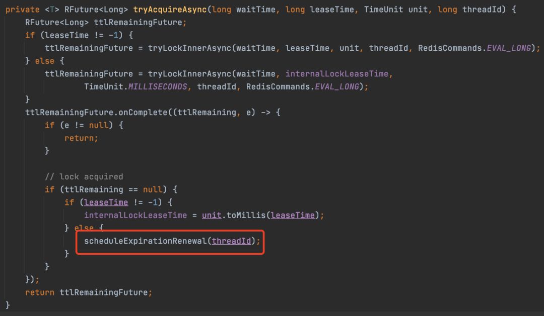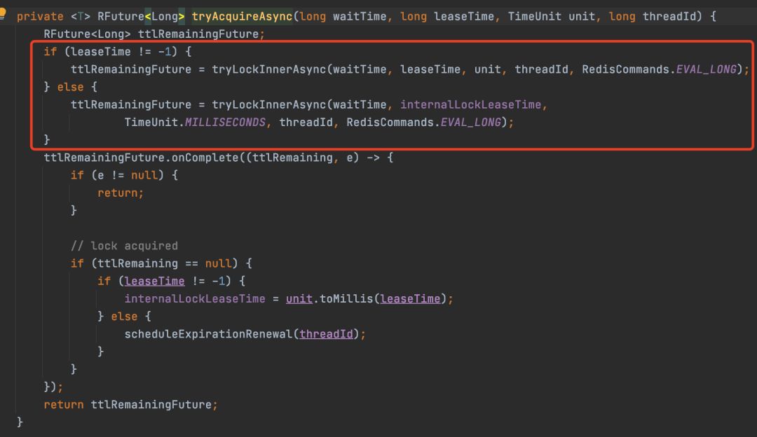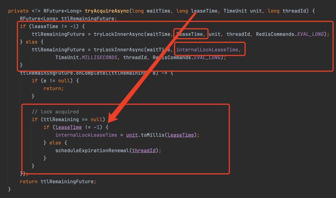 tryAcquireAsync方法会根据leaseTime是不是-1来判断使用哪个分支加锁,其实不论走哪个分支,最后都是调用tryLockInnerAsync方法来实现加锁,只不过是参数不同罢了。但是我们这里的leaseTime其实就是-1,所以会走下面的分支,尽管传入到tryAcquireAsync的leaseTime是-1,但是在调用tryLockInnerAsync方法传入的leaseTime参数是internalLockLeaseTime,默认是30s。