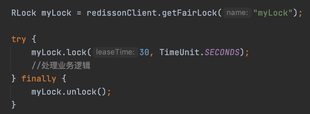 Redisson的加锁使用代码如下,接下来会有几节着重分析一下这段代码逻辑背后实现的原理。