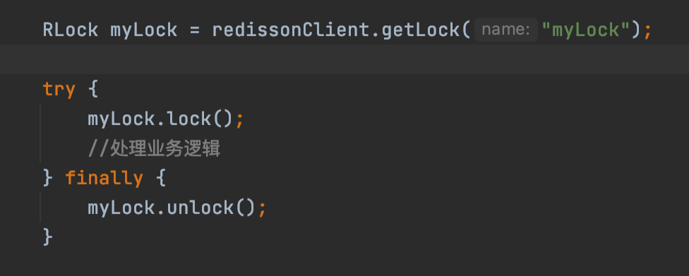 先通过RedissonClient,传入锁的名称,拿到一个RLock,然后通过RLock实现加锁和释放锁。
