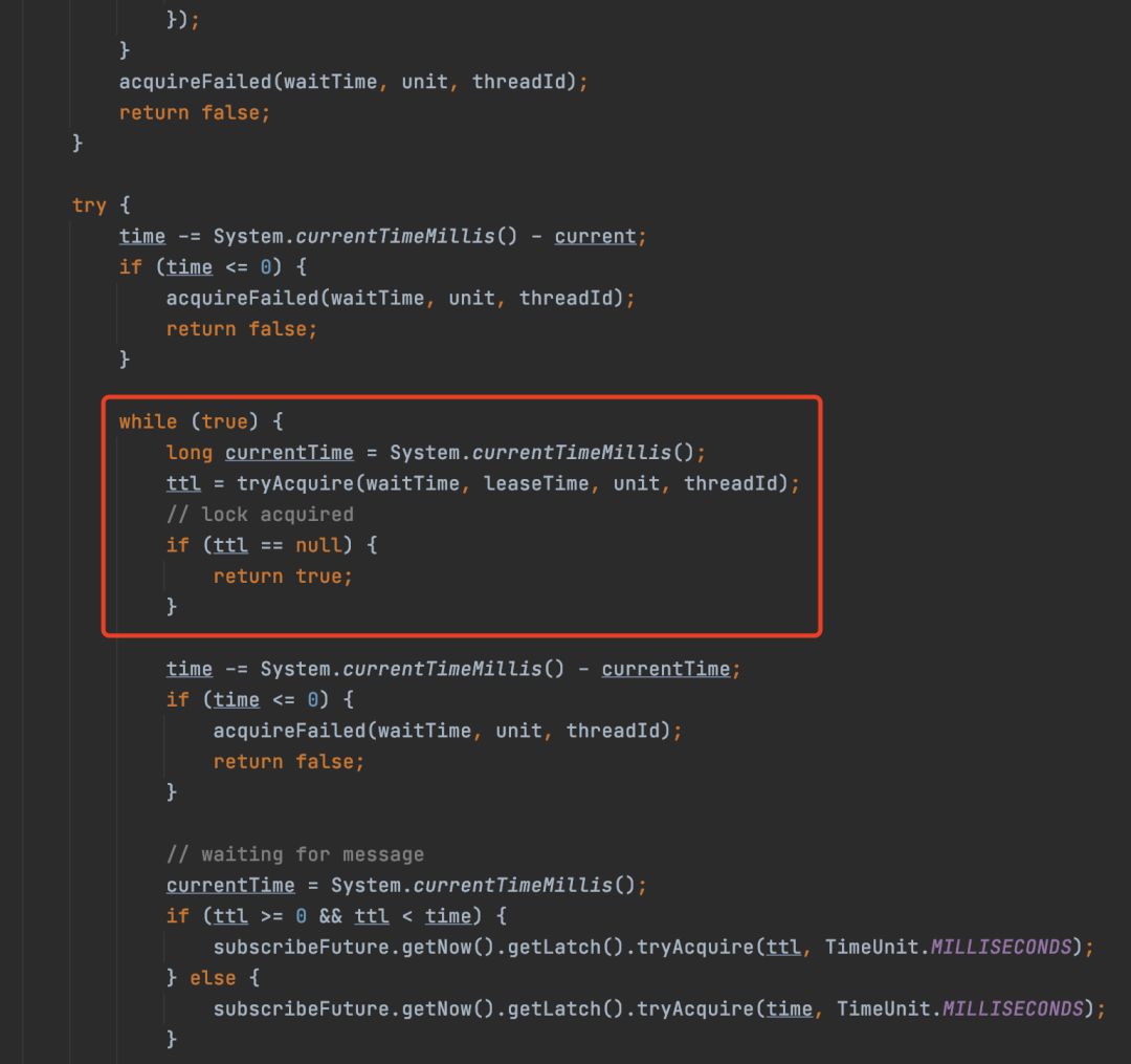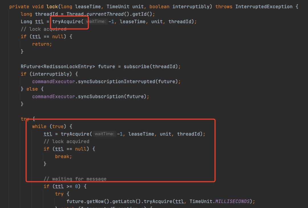 其实通过源码就可以看出是怎么实现一定时间之内还未获取到锁就放弃加锁的逻辑,其实相比于一直获取锁,主要是加了超时的判断,如果超时了,那么就退出循环,放弃加锁,