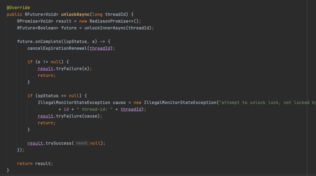 unlockAsync最后会调用RedissonLock的unlockInnerAsync来实现释放锁的逻辑。