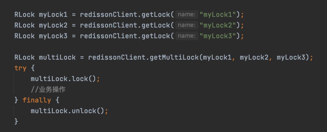 比如说,在一个下单的业务场景中,同时需要锁定订单、库存、商品,基于这种需要锁多种资源的场景中,Redisson提供了批量加锁的实现,对应的实现类是RedissonMultiLock。