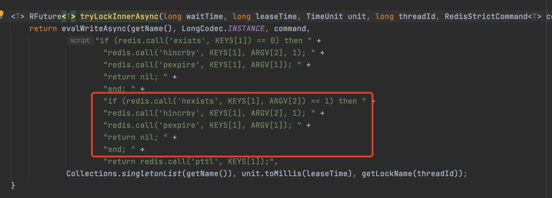 所以加锁lua脚本的第二段if的逻辑其实是实现可重入加锁的逻辑。