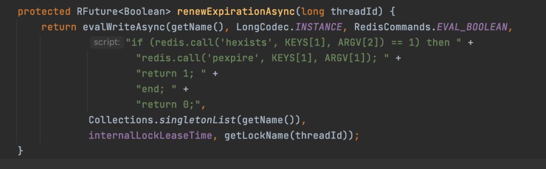 最后会定期执行如下的一段lua脚本来实现加锁时间的延长。