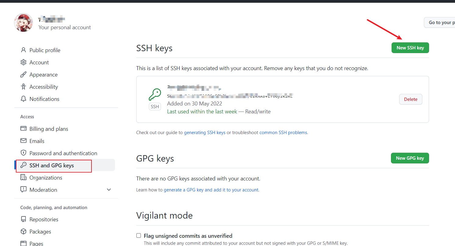 - 点击SSH and GPG keys,然后点击Add SSH Key