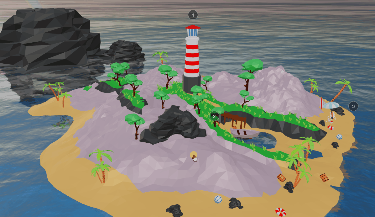 开发之前,需要准备页面所需的素材,本文用到的海岛素材是在 sketchfab.com 找的免费模型。下载好素材之后,在 Blender 中打开,按自己的想法调整模型的颜色、材质、大小比例、角度、位置等信息,删减不需要的模块、缩减面数以压缩模型体积,最后删除相机、光照、UV、动画等多余信息,只导出模型网格备用。