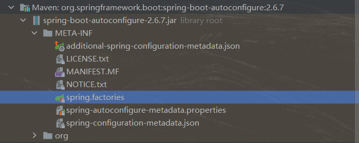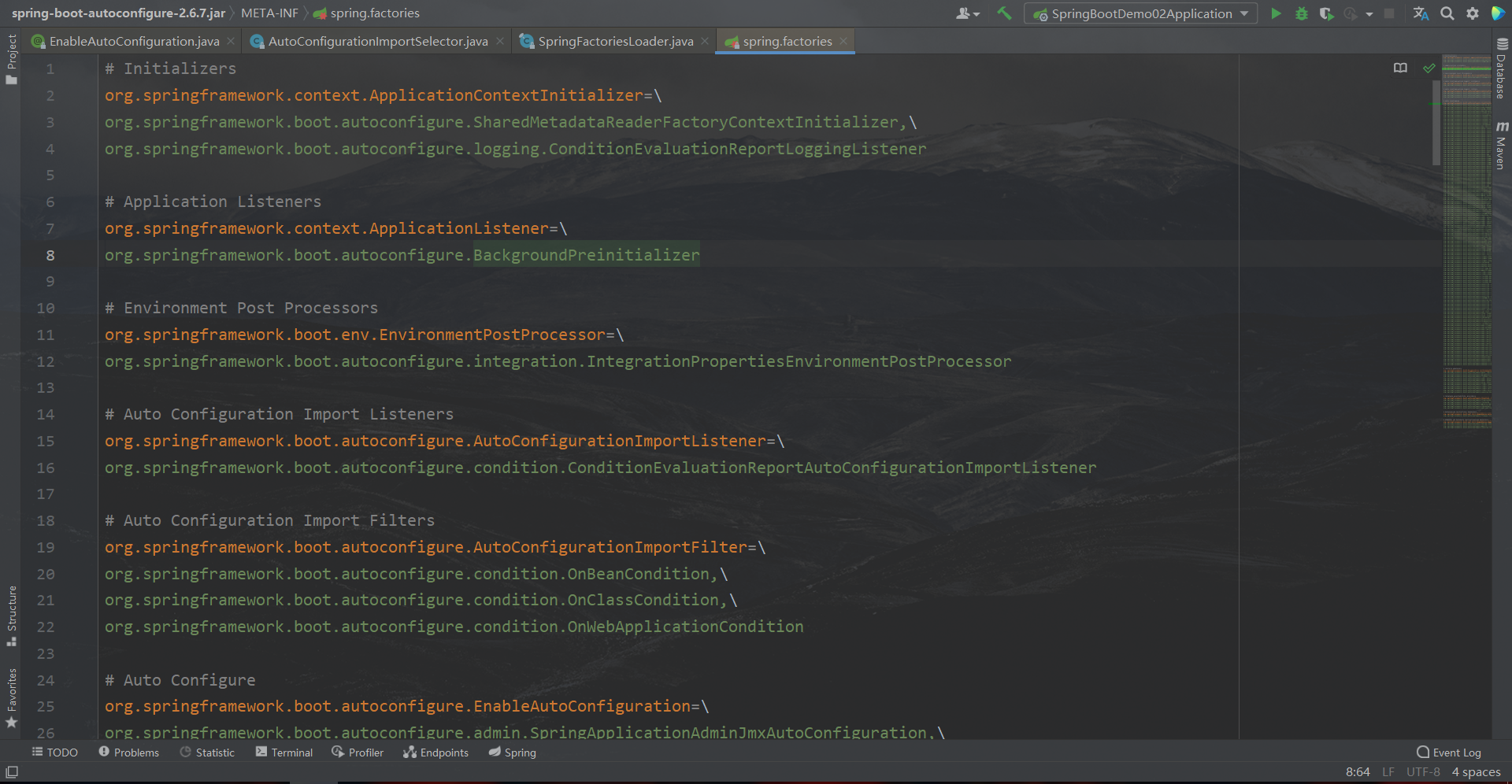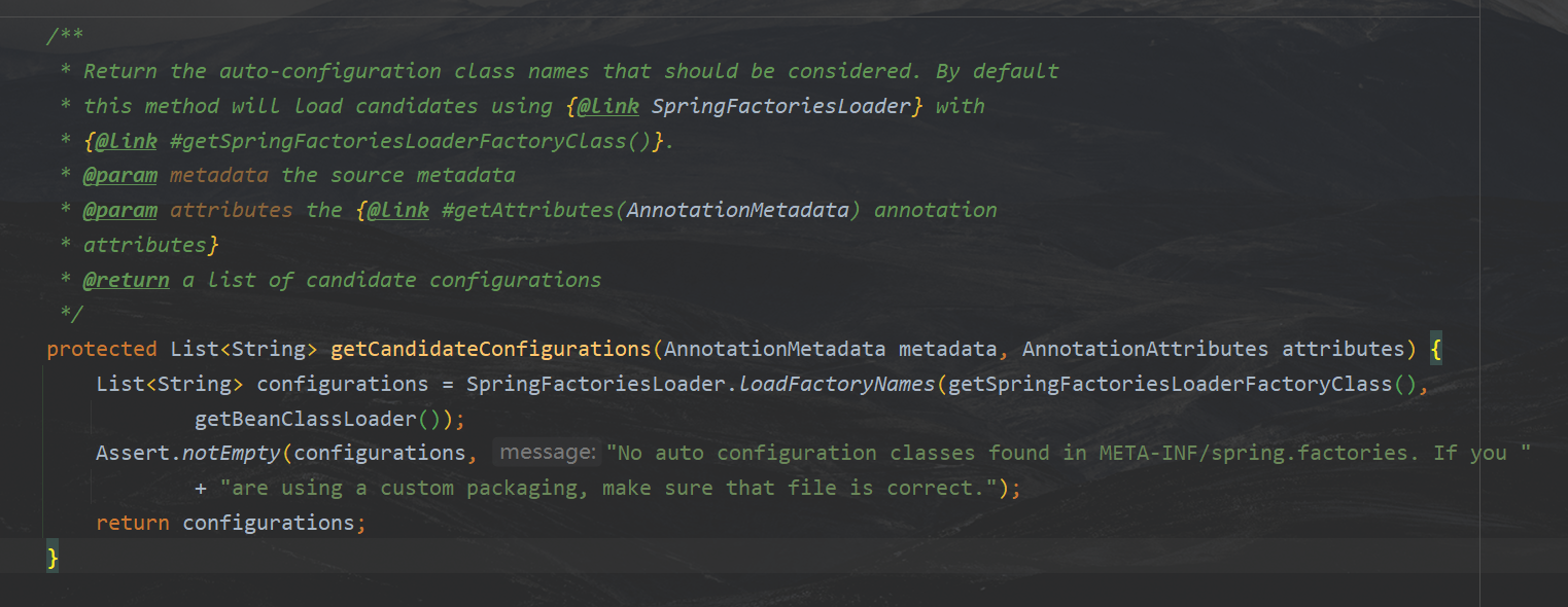 在候选配置中,我们注意到它调用了一个SpringFactoriesLoader.loadFactoryNames()方法:
