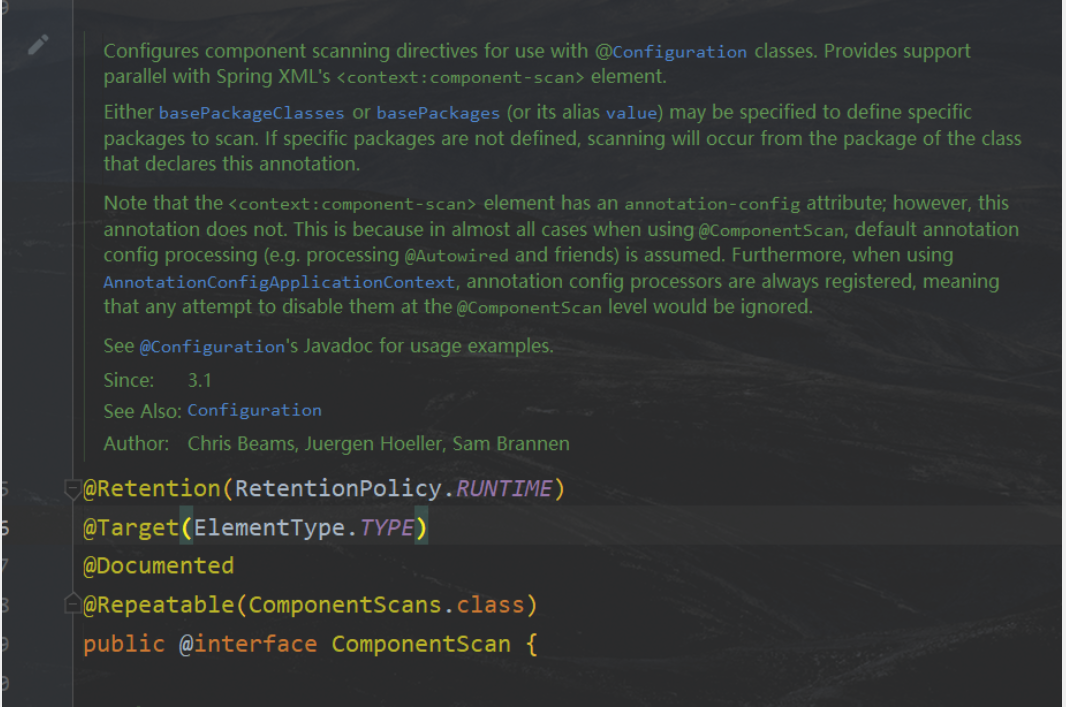 @Target(ElementType.TYPE) @Retention(RetentionPolicy.RUNTIME) @Documented @Inherited四大元注解。
