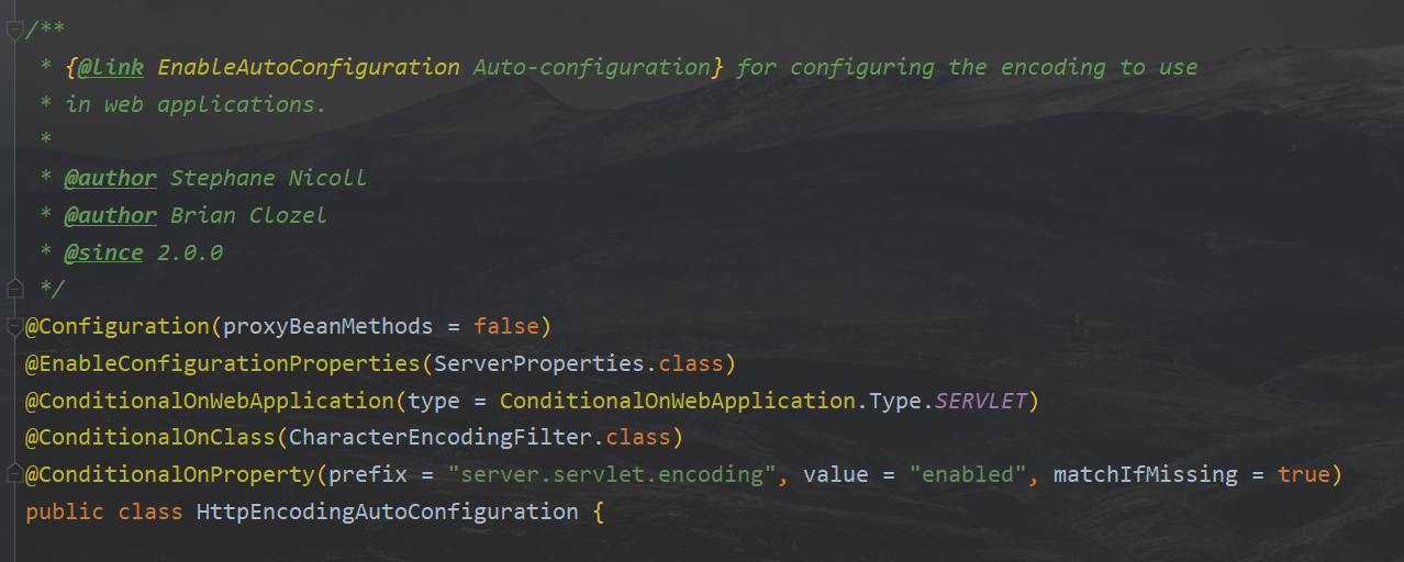 这里的意思就是判断当前应用是否是web应用,如果是,当前配置类生效@ConditionalOnClass(CharacterEncodingFilter.class)判断当前项目有没有这个类CharacterEncodingFilter;SpringMVC中进行乱码解决的过滤器;