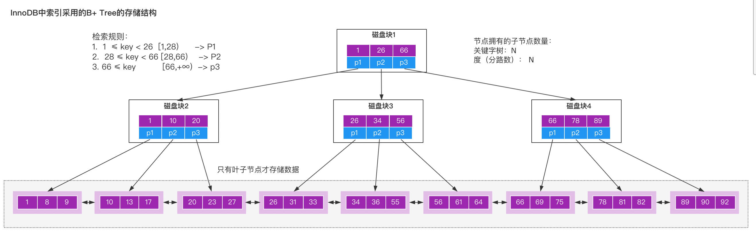 - B+树索引在进行范围查找的时候,只需要找到起始节点,然后基于叶子节点的链表结构往下读取即可,查询效率较高。