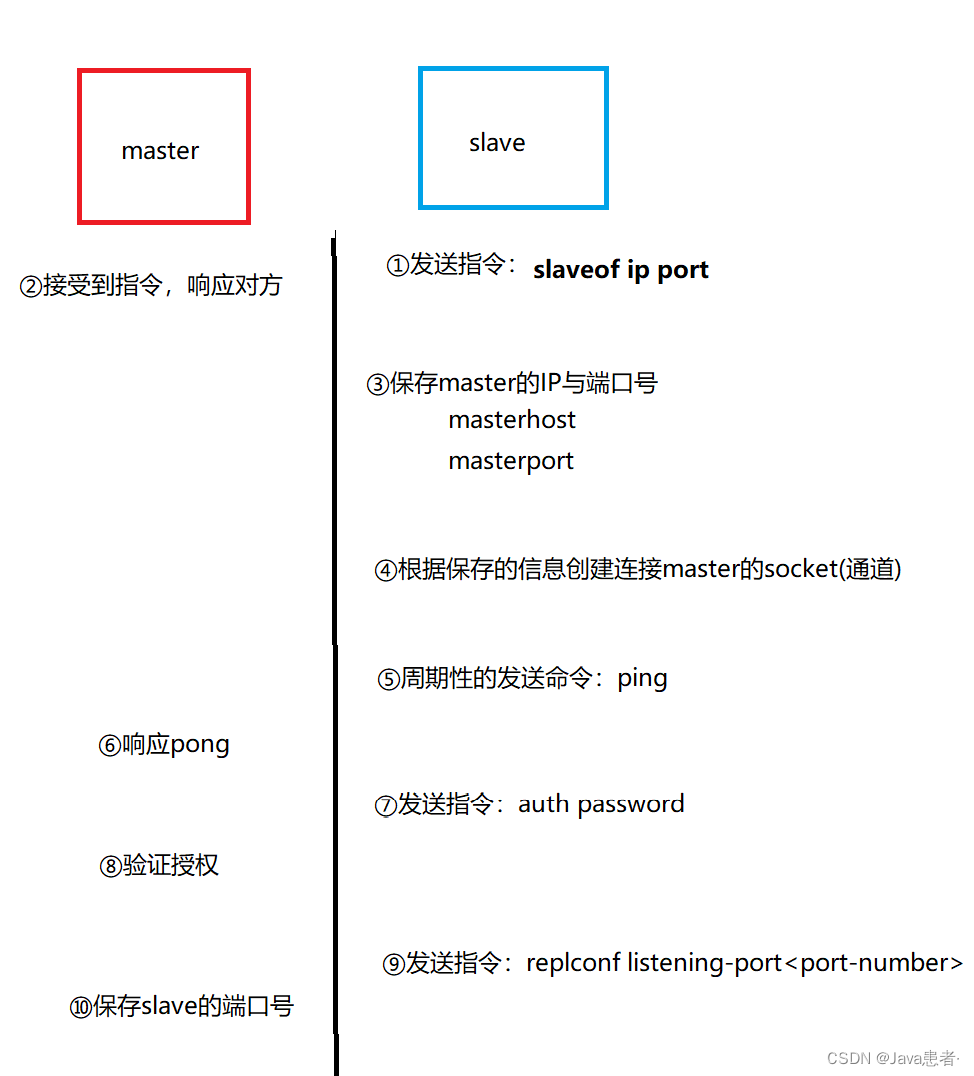 slave服务器发送master的ip地址和端口号,master收到并响应回去。slave接受到响应之后保存master的ip和端口号,并根据保存的信息建立stocket通道,同时开启周期性的ping,master也会回应pong。最后slave发送自己的端口号给master,master保存slave的端口号