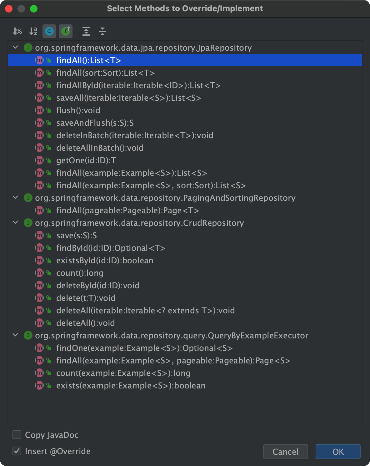 可以看到最后一行是SpringDataJPA为我们生成的查询语句,我们并没有写sql,只是调用的SpringDataJPA自带的方法,让我们去看一下SpringDataJPA都为我们提供哪些可用的方法